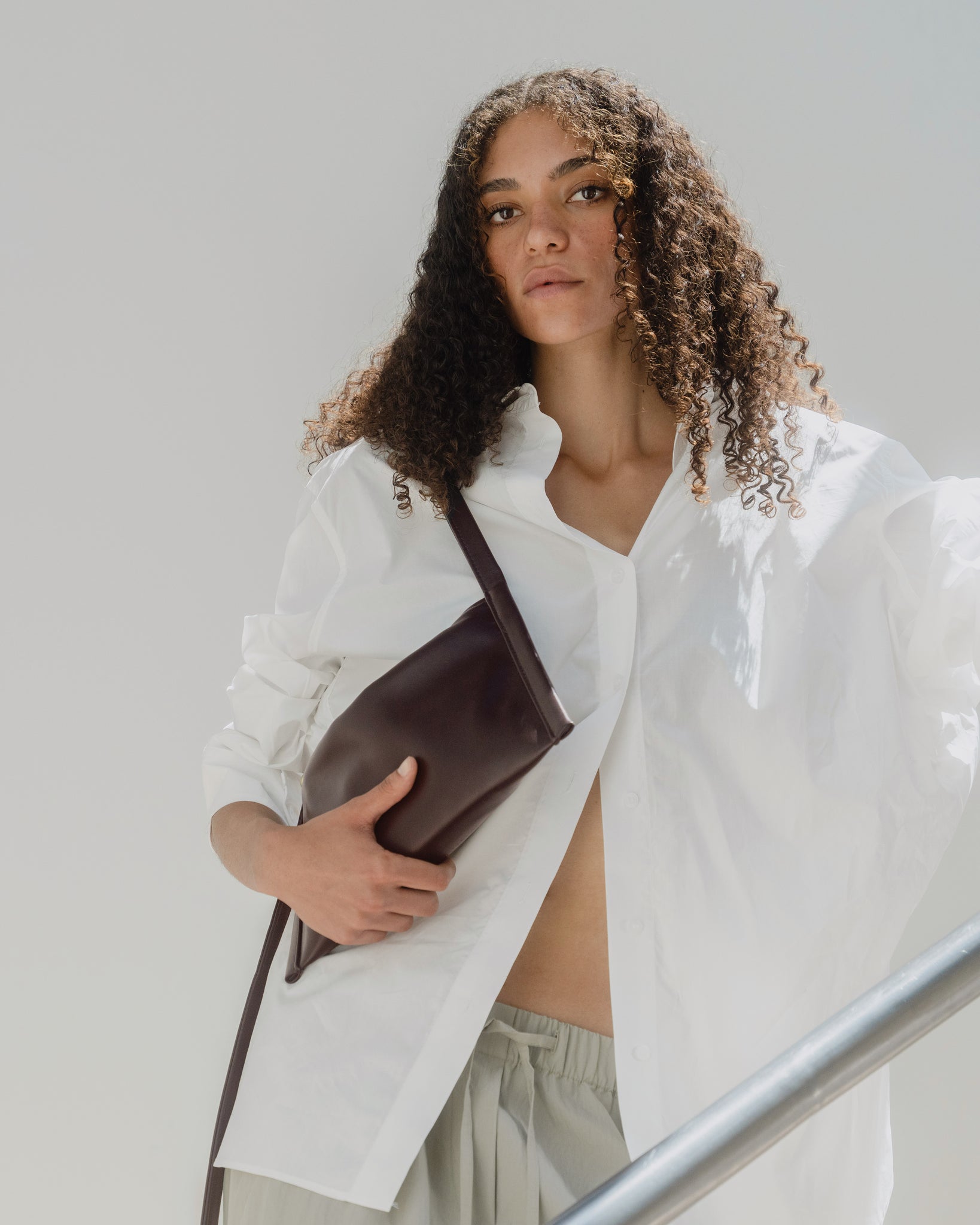 Coffee supple-smooth leather body with an adjustable matching leather shoulder strap
