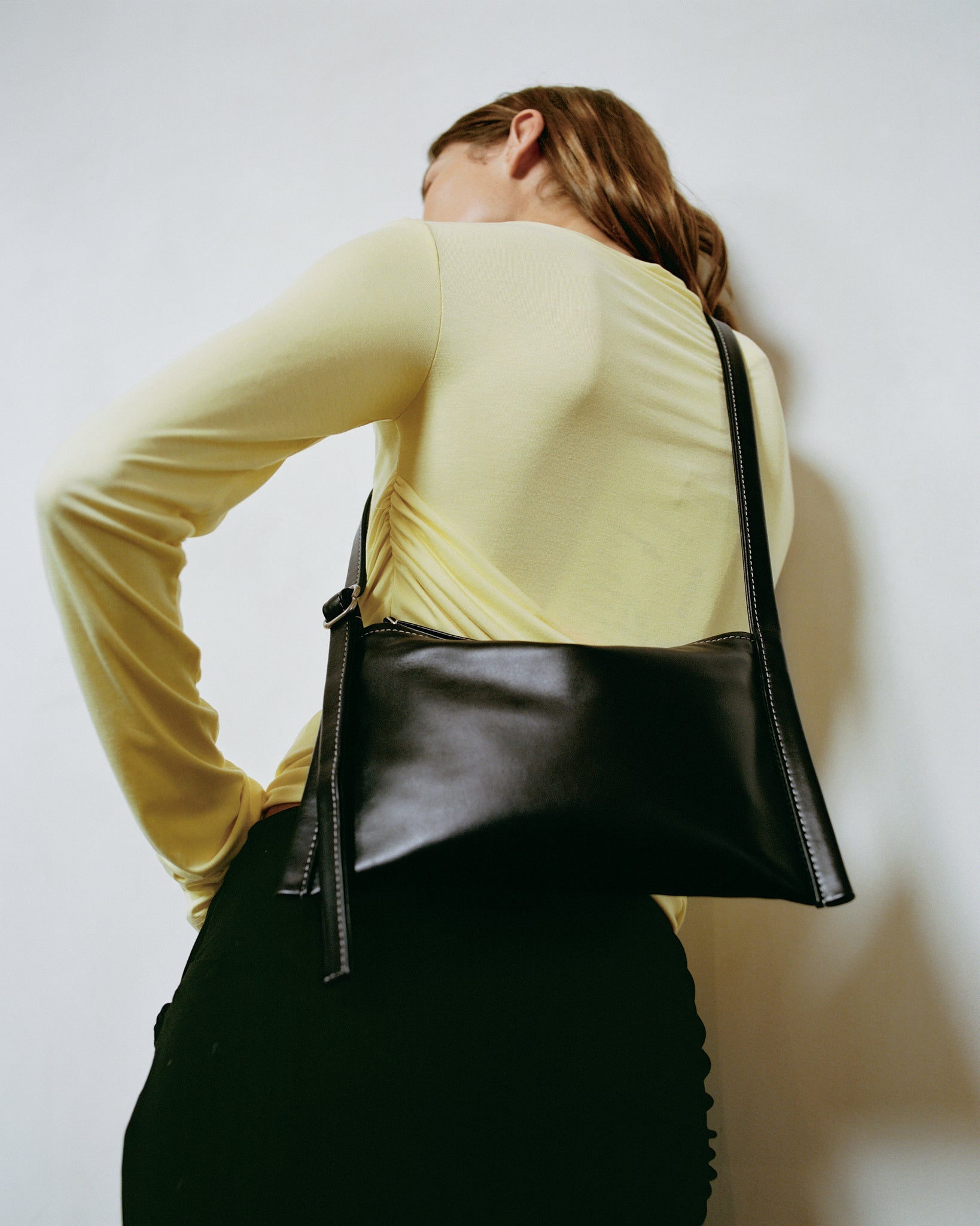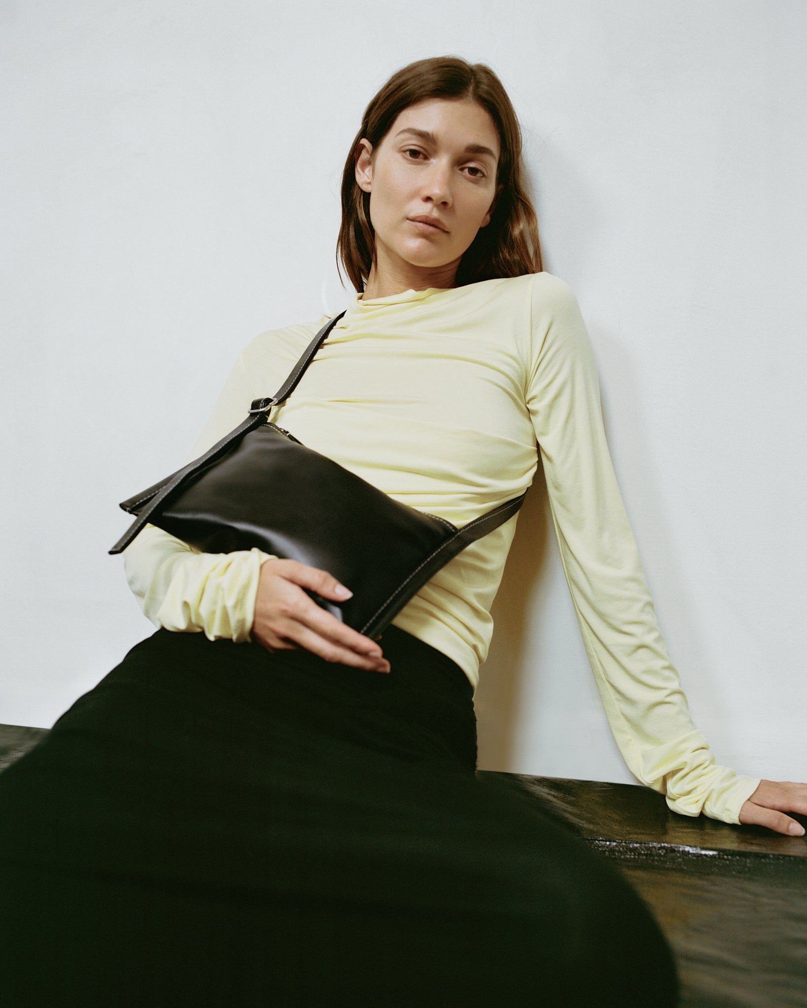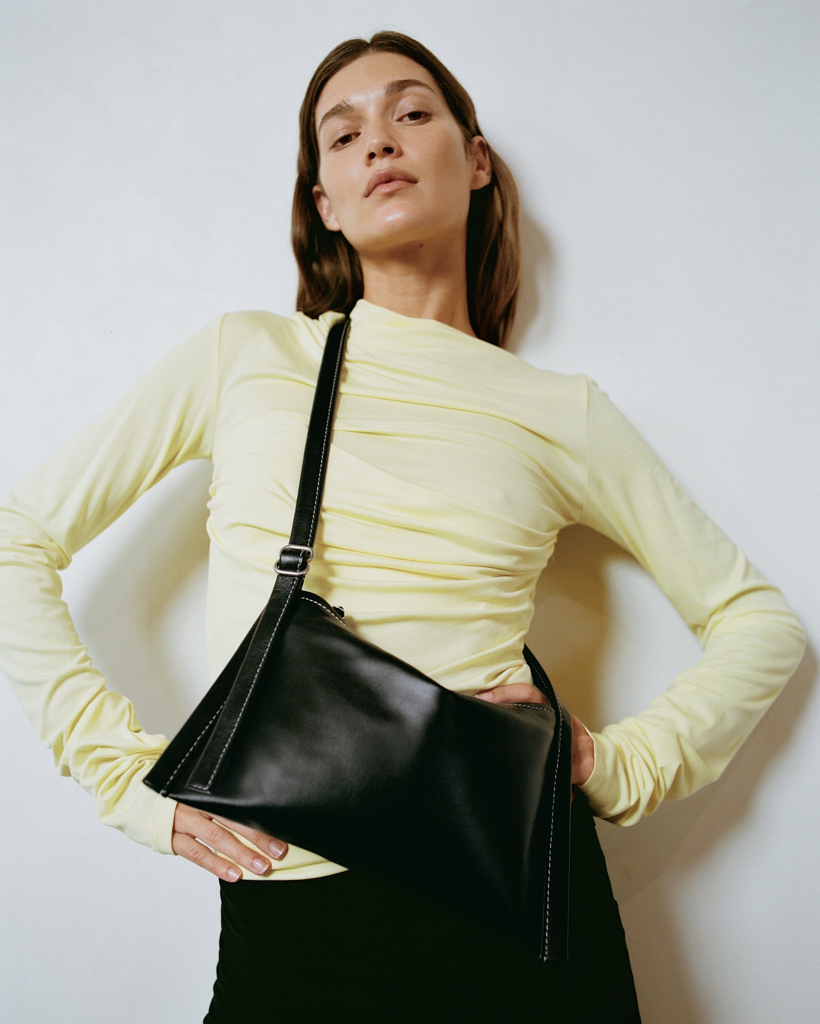 Finely honed in its simplicity and detail, this essential bag is made for every occasion. The Black hue is deep and lustrous, with a supple feel, smooth finish, and sumptuous touch. Contrasted white stitching frames the silhouette, adding refined definition and a contemporary edge. It sits flat yet shapes naturally around what it carries, making it the perfect travel companion. Its adjustable strap offers effortless versatility, carrying with ease from day to evening.