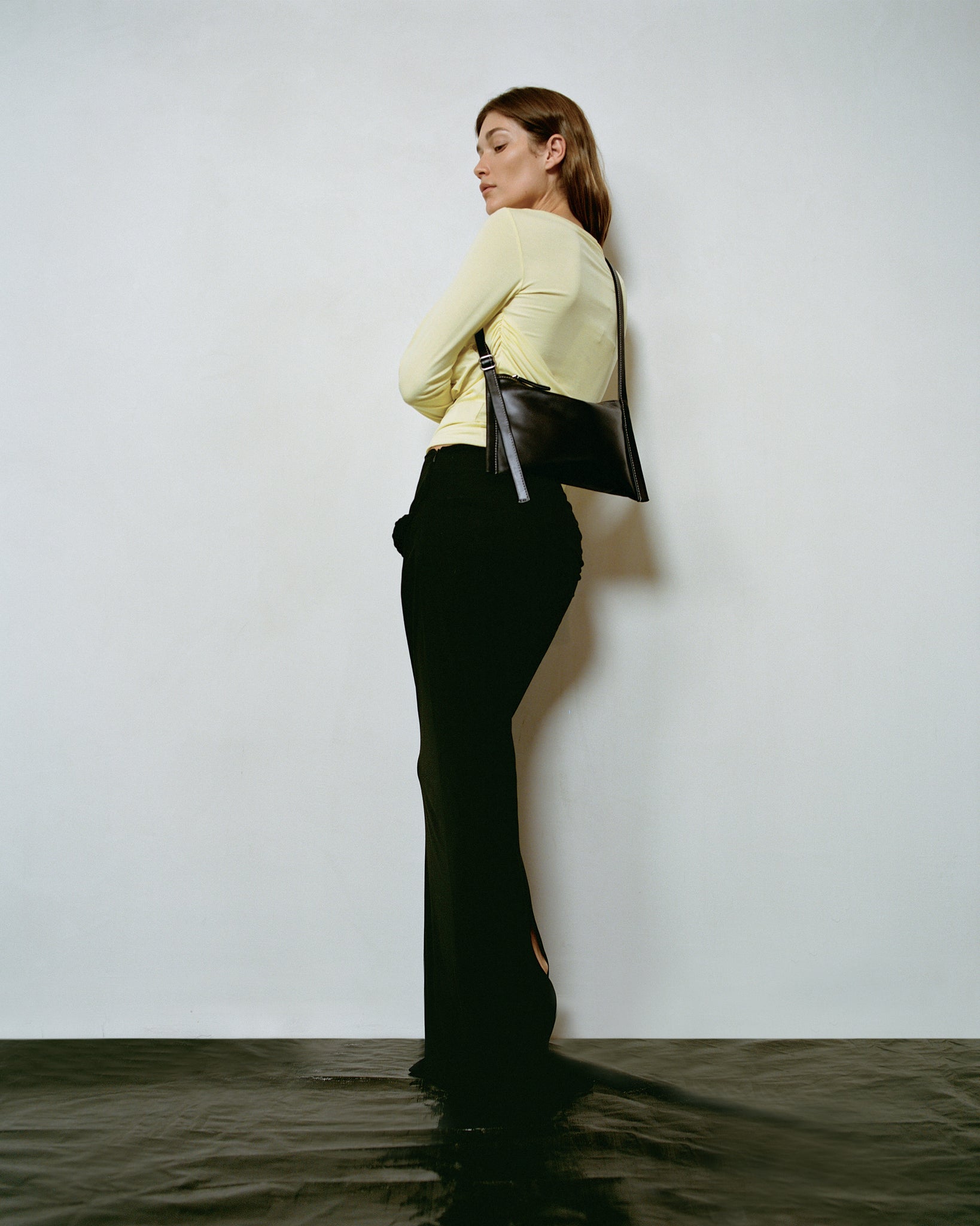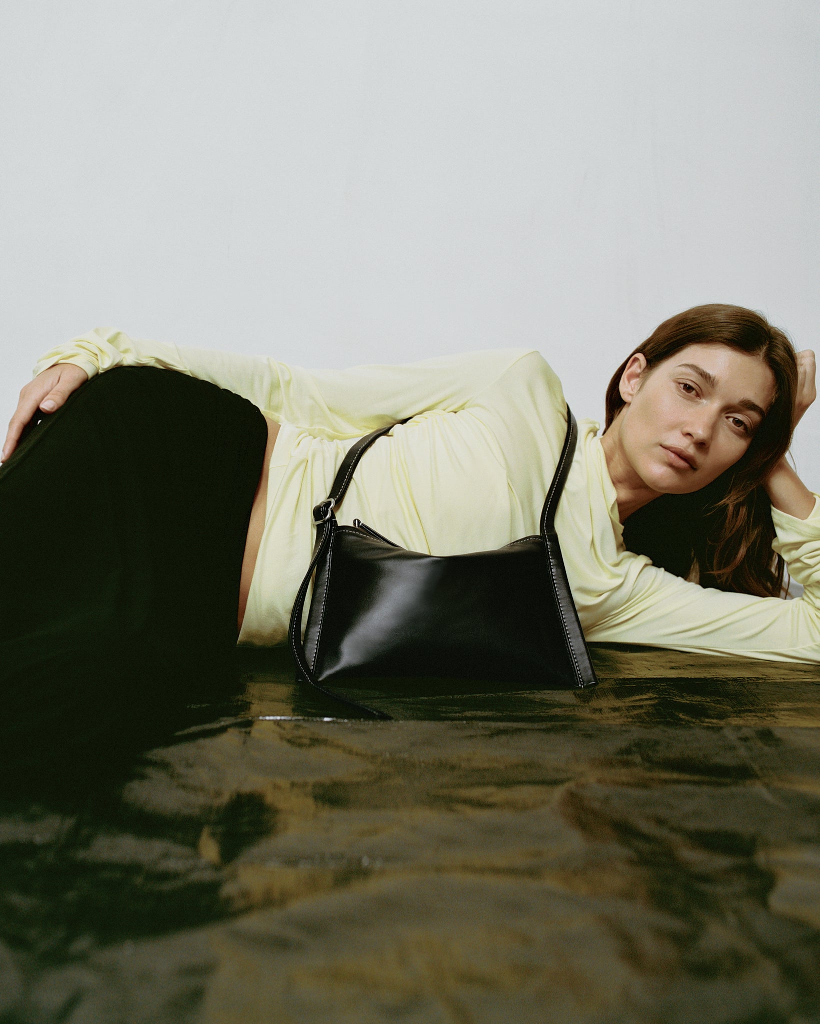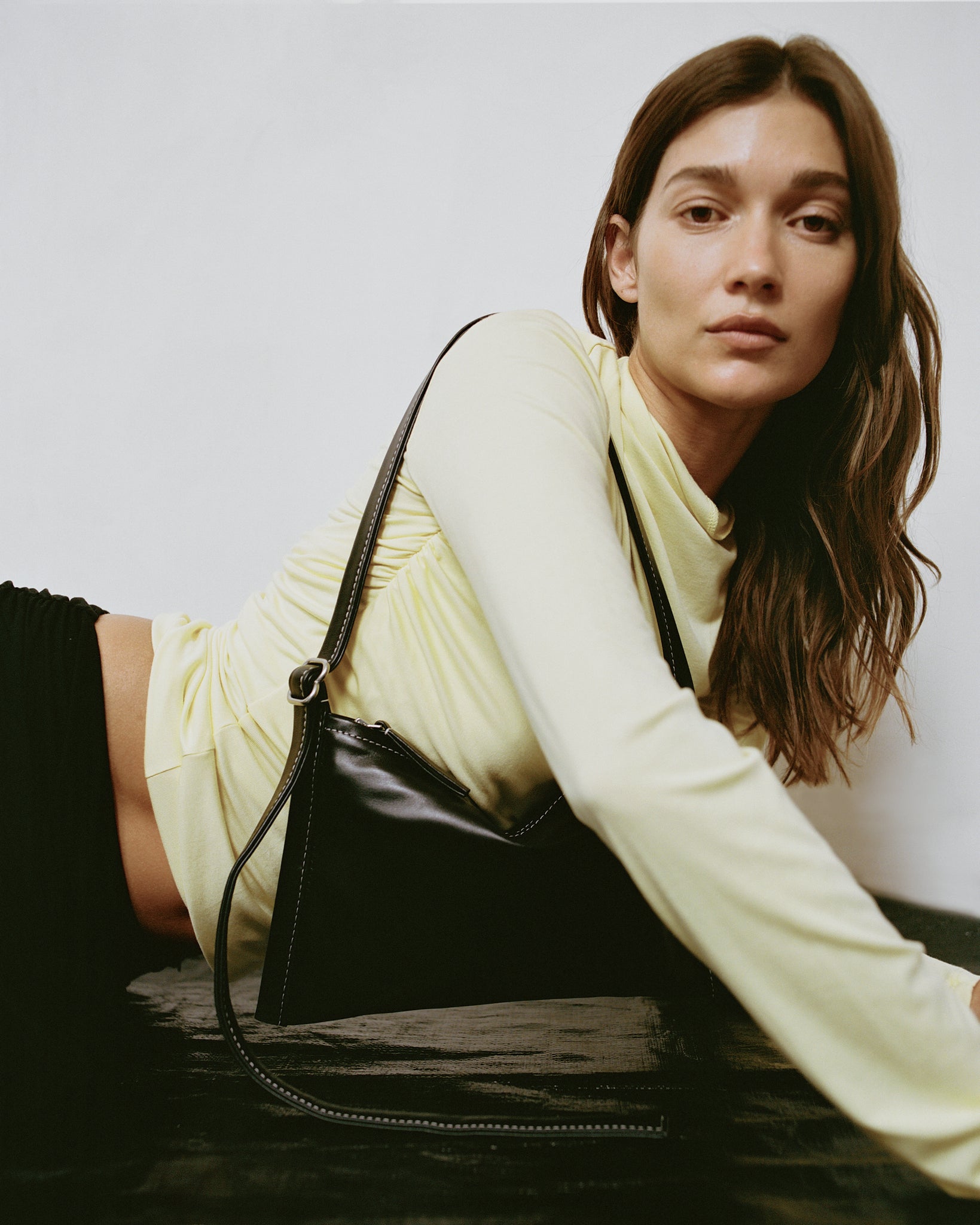 Finely honed in its simplicity and detail, this essential bag is made for every occasion. The Black hue is deep and lustrous, with a supple feel, smooth finish, and sumptuous touch. Contrasted white stitching frames the silhouette, adding refined definition and a contemporary edge. It sits flat yet shapes naturally around what it carries, making it the perfect travel companion. Its adjustable strap offers effortless versatility, carrying with ease from day to evening.