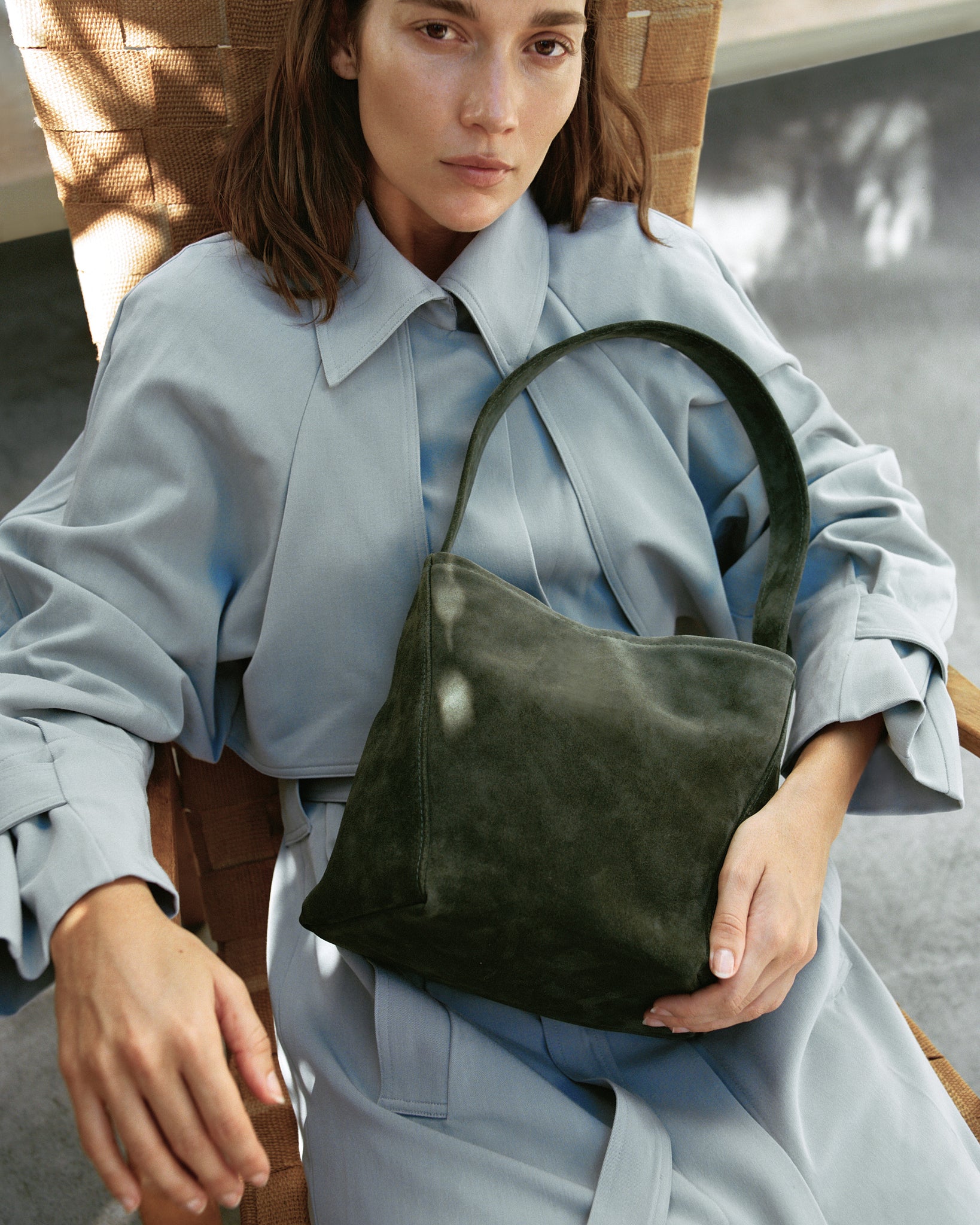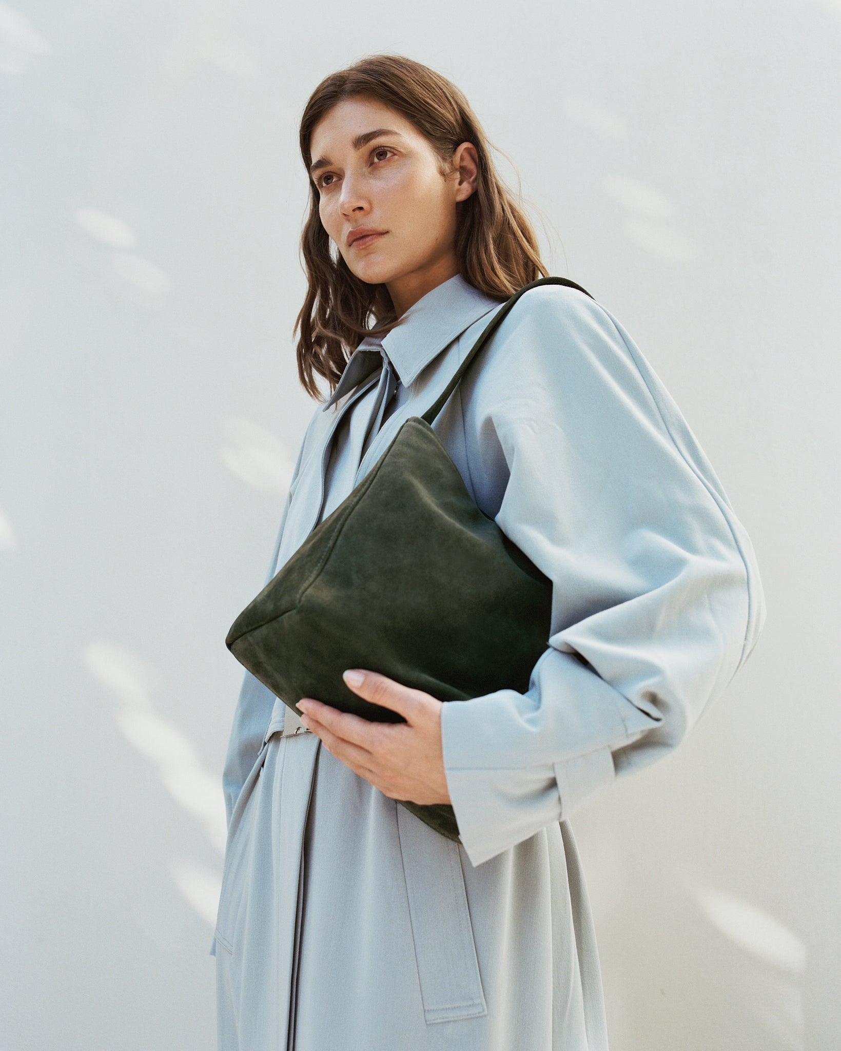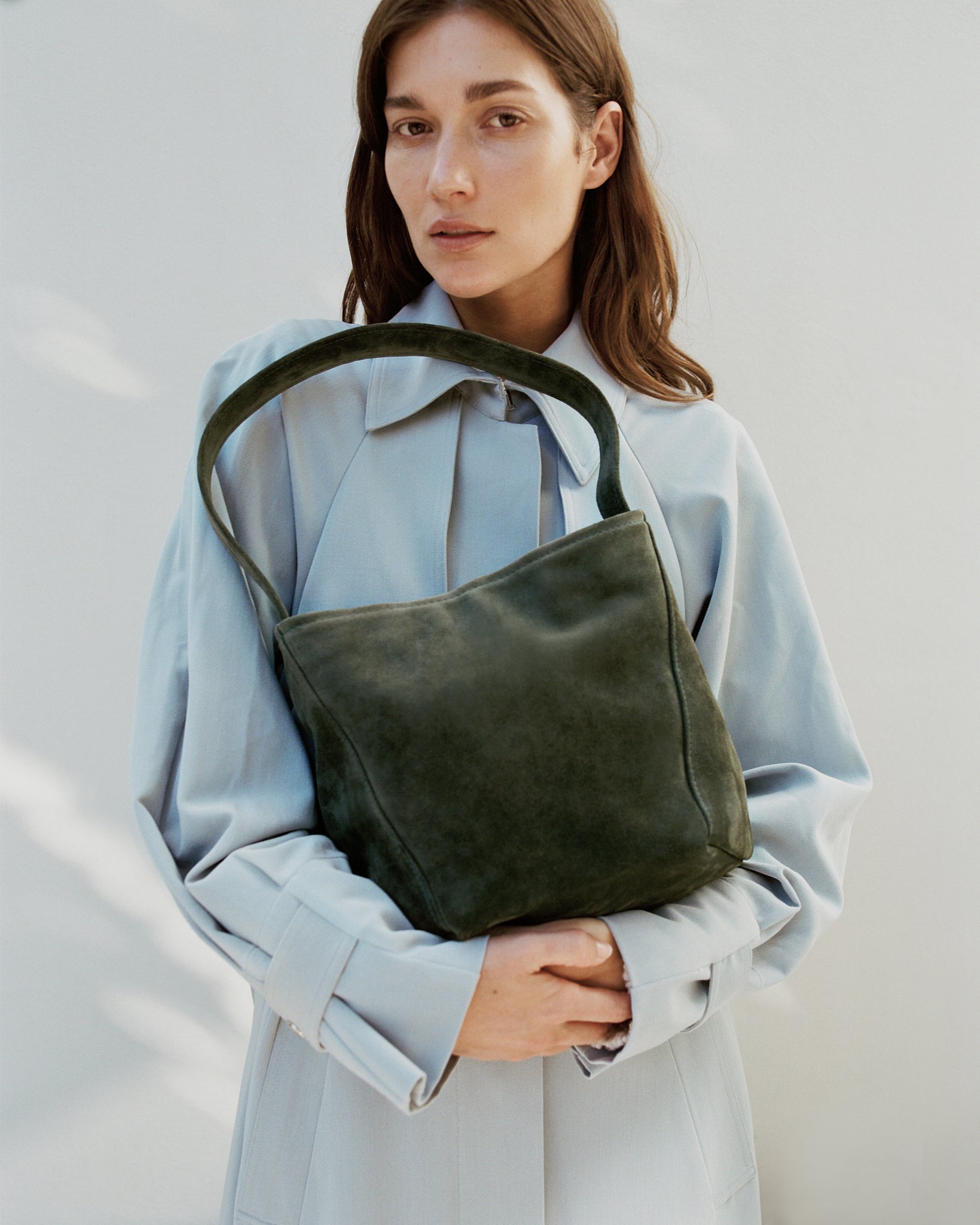 Defined by sculptural form and refined detailing, the Medium Magda is a modern bucket bag for those who value minimalist design and function. The Moss Green hue is a rich, grounded tone with a silky touch and sumptuous suede texture, adding depth and refinement to its silhouette. A gently tilted shape, angled seams, and hand-finished stainless-steel toggle lend an elevated touch with a contemporary edge.