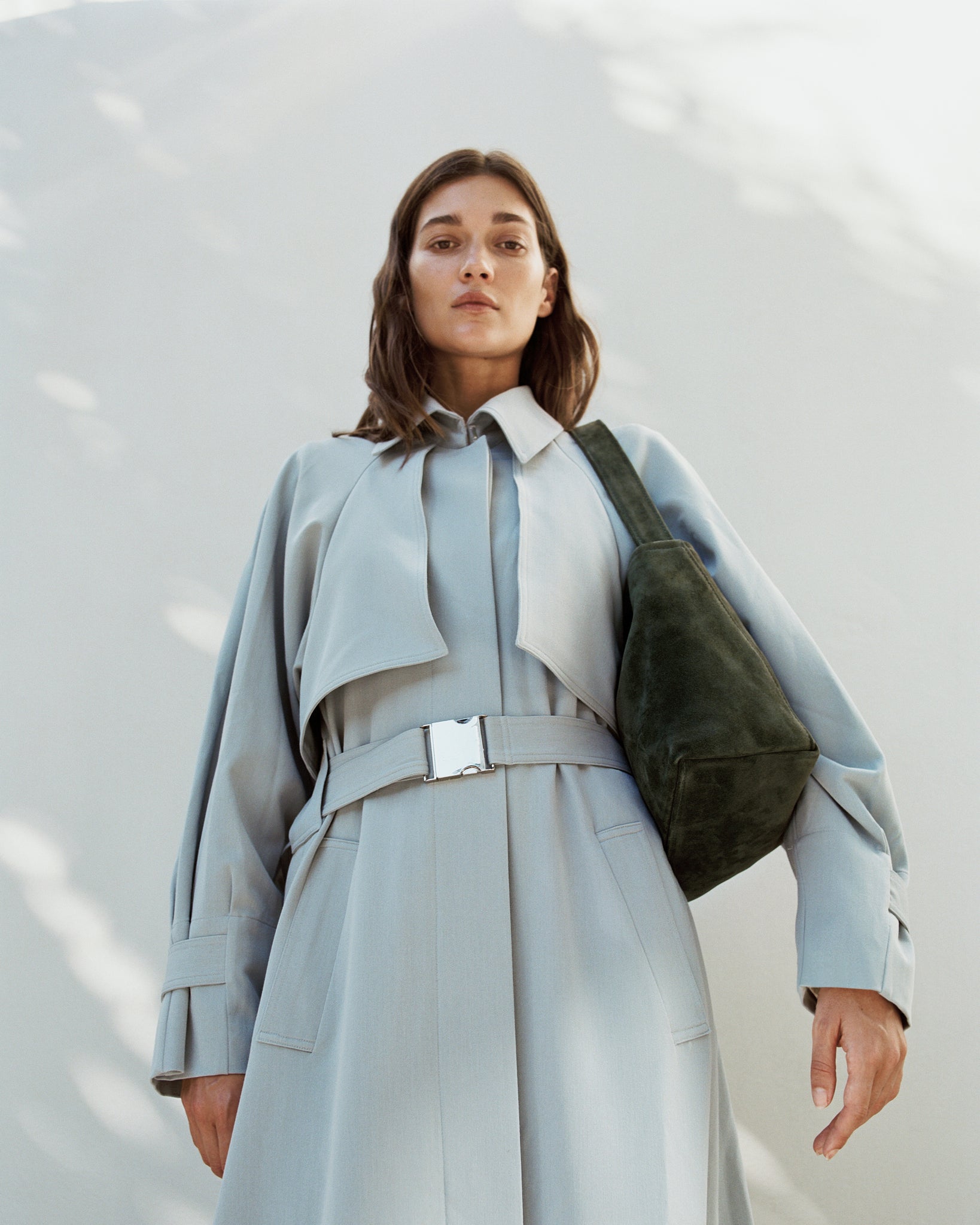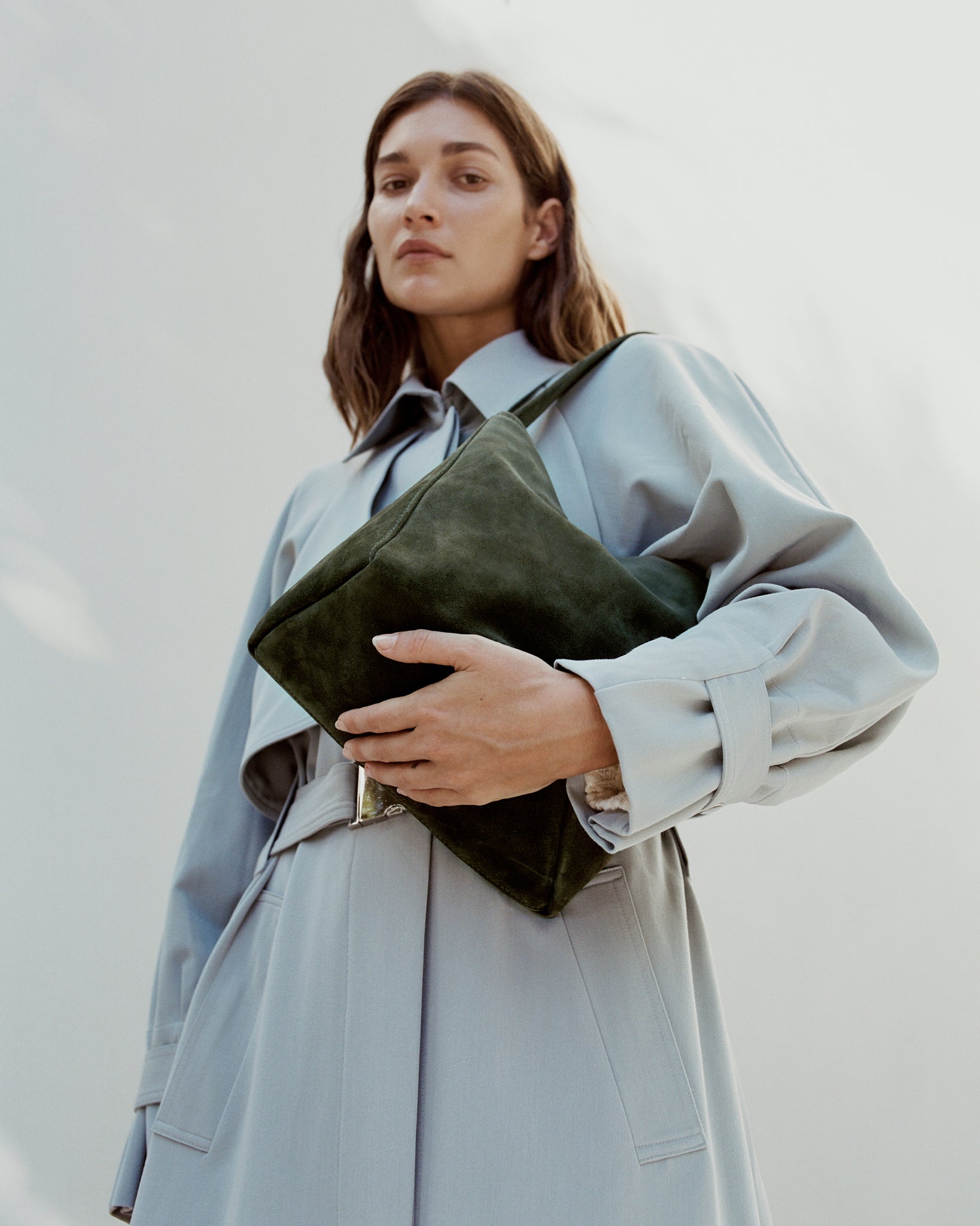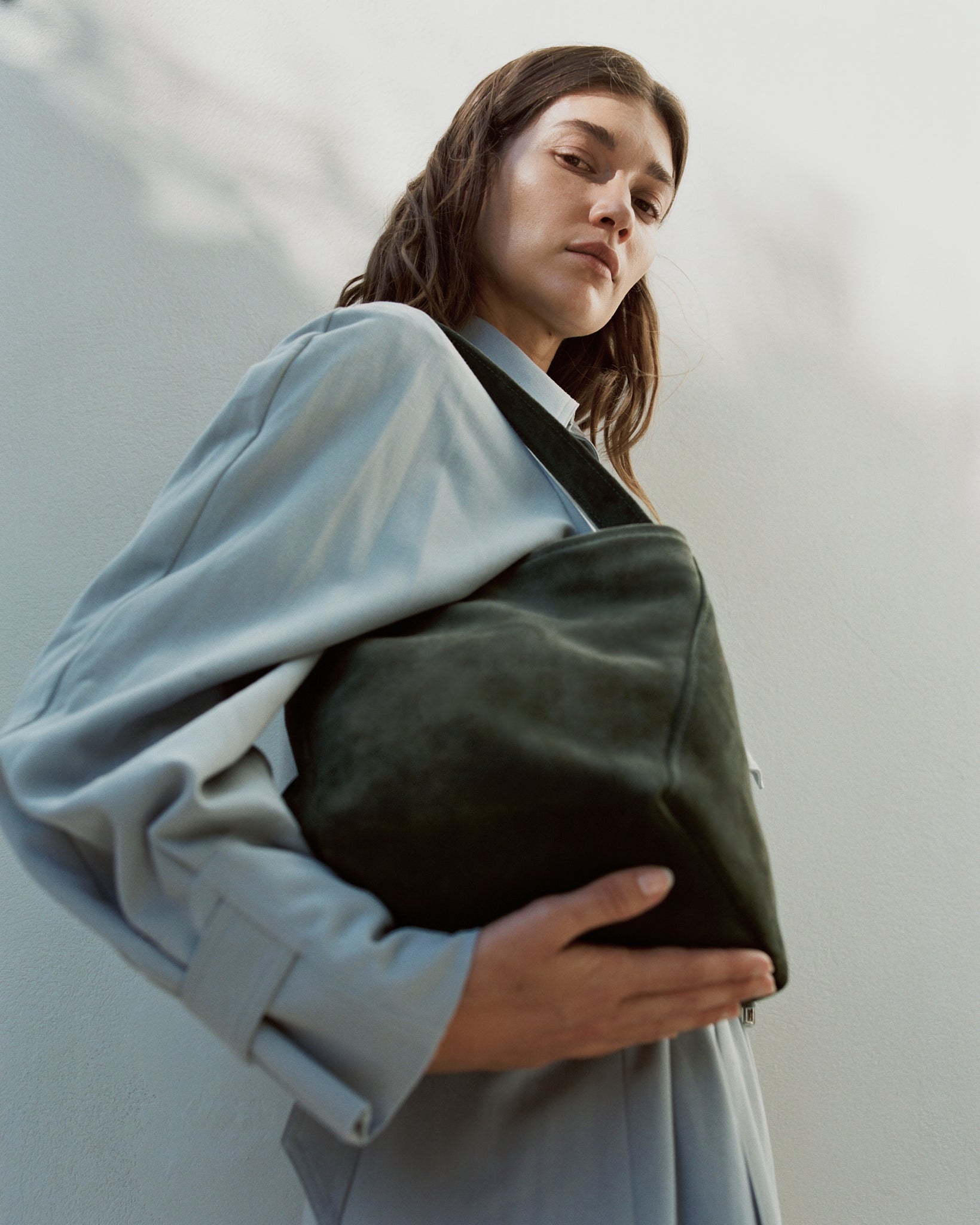 Defined by sculptural form and refined detailing, the Medium Magda is a modern bucket bag for those who value minimalist design and function. The Moss Green hue is a rich, grounded tone with a silky touch and sumptuous suede texture, adding depth and refinement to its silhouette. A gently tilted shape, angled seams, and hand-finished stainless-steel toggle lend an elevated touch with a contemporary edge.