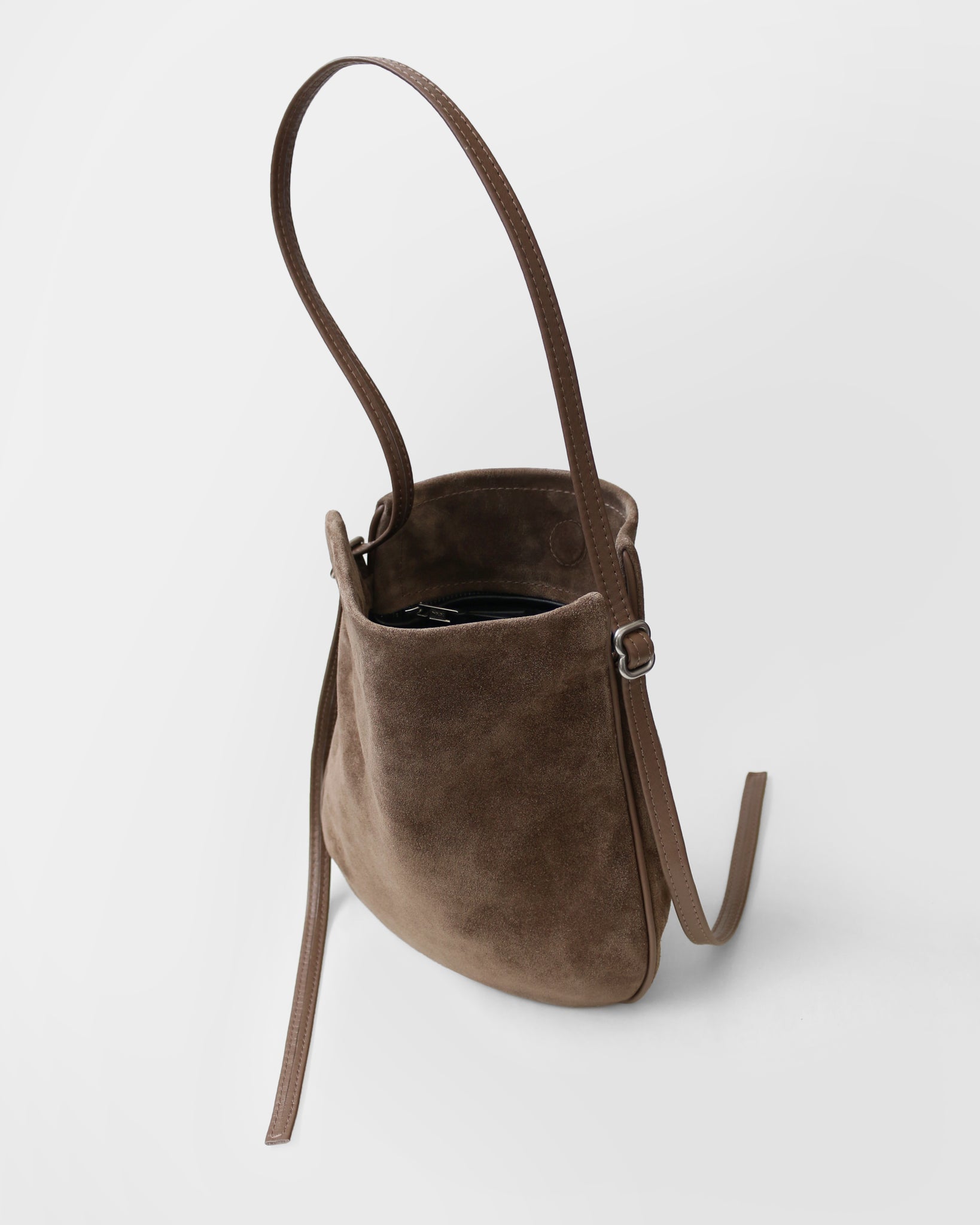 Penny silken-napped suede body with tonal nappa leather piping and matching leather shoulder strap