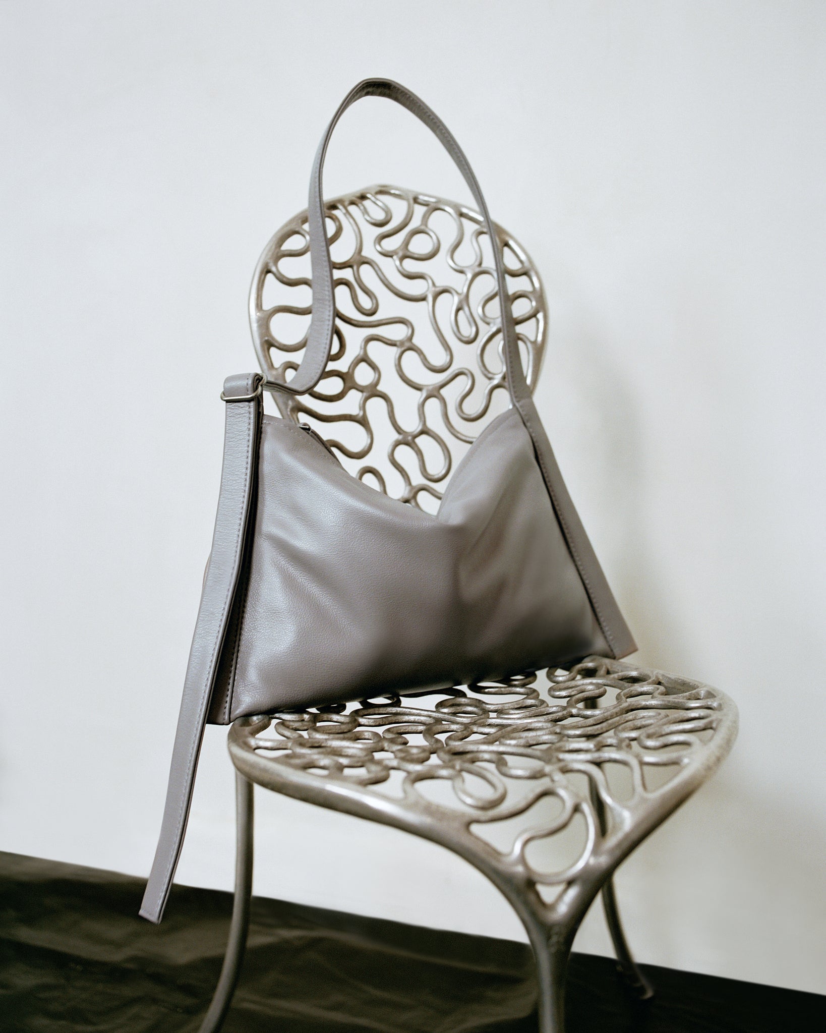 Lunar grey leather body with adjustable matching leather shoulder strap