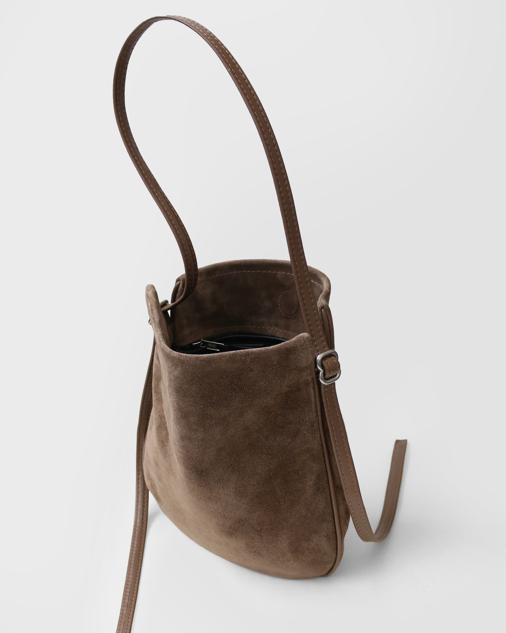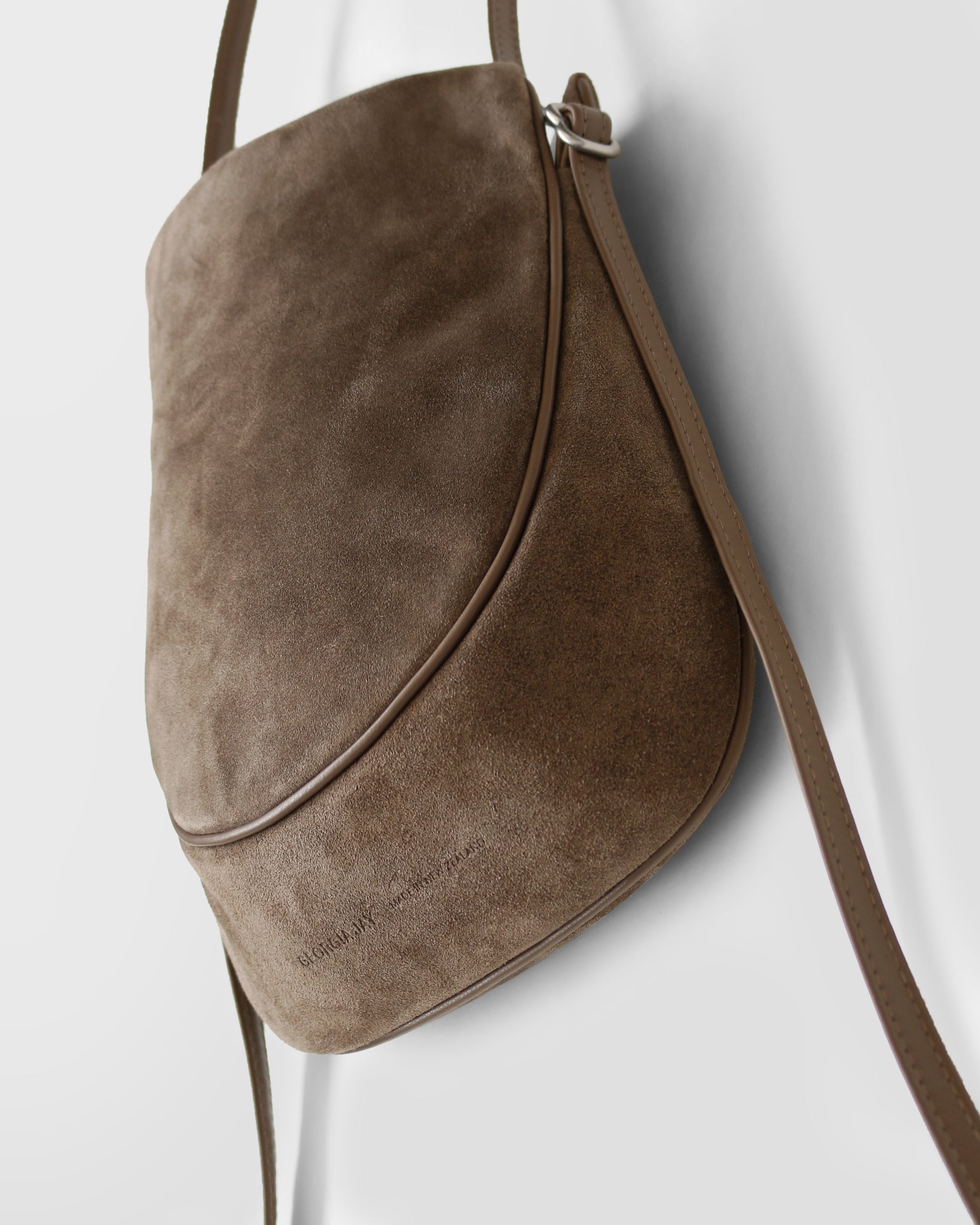 Penny silken-napped suede body with tonal nappa leather piping and matching leather shoulder strap