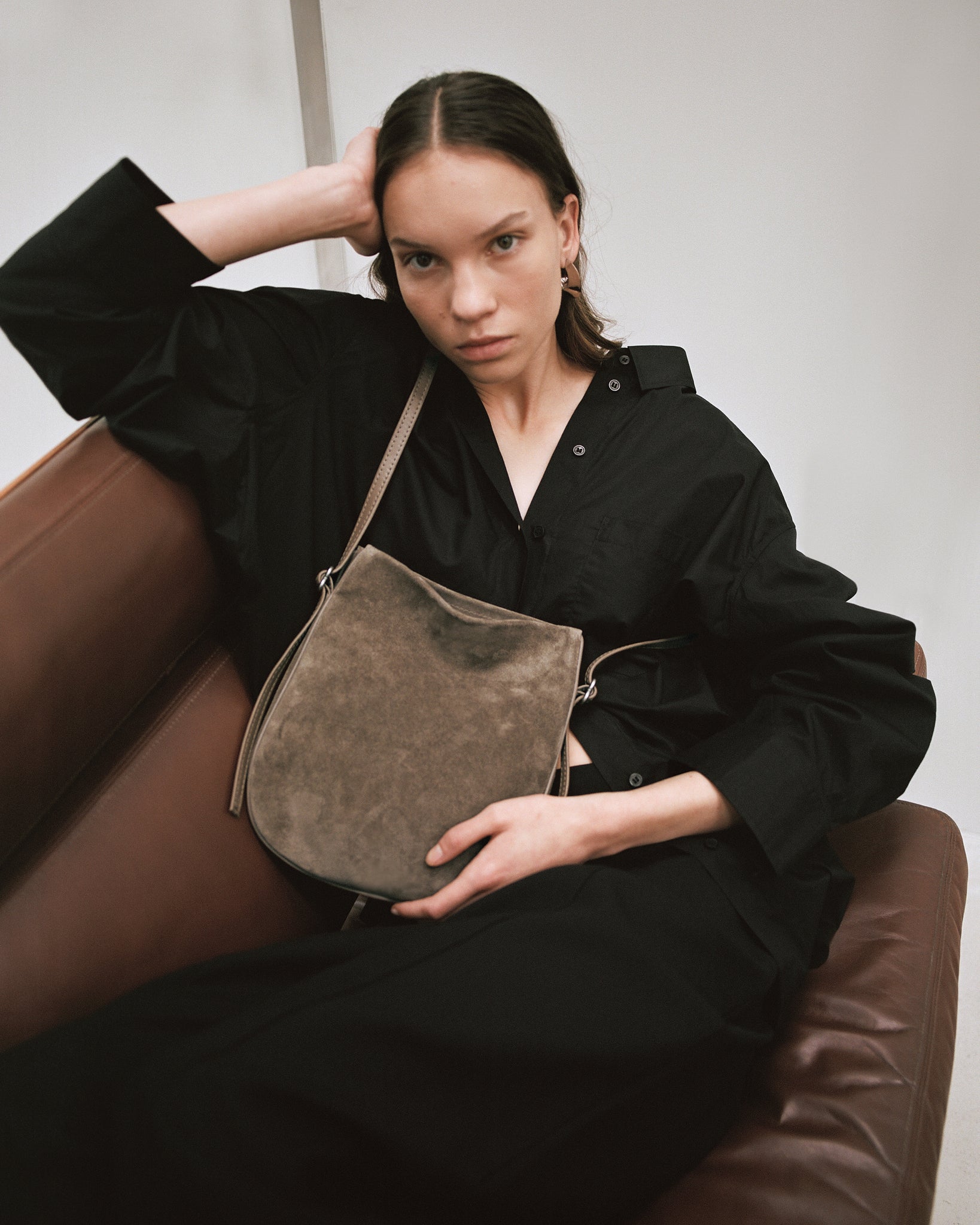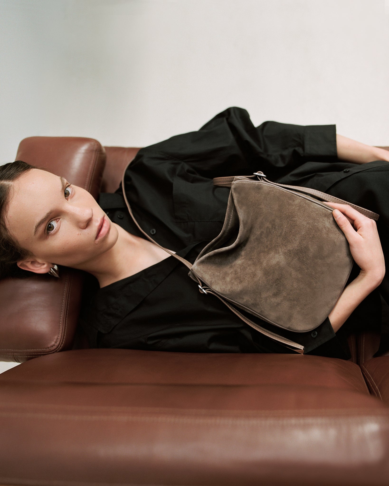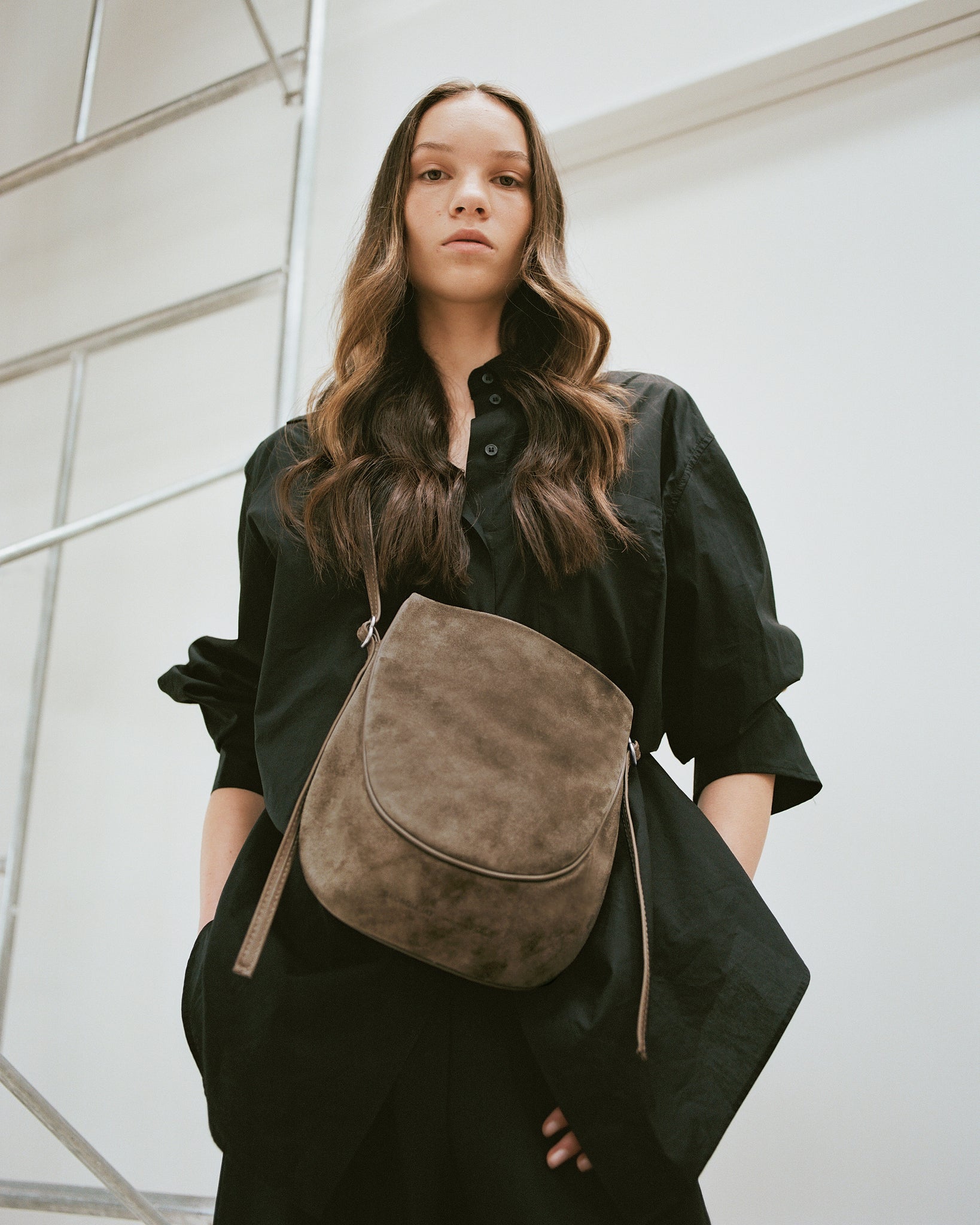 Fluid in form and softly expressive, the Ovo Pouch reveals a sculptural silhouette defined by material contrast. The Penny hue is an earthy taupe with a silky suede touch. Fine tonal leather piping accents the seamless front and continues through the contoured back panels, tracing gentle lines that add depth and dimension. Designed to move with ease, it rests naturally against the body, while the adjustable strap offers versatile wear.