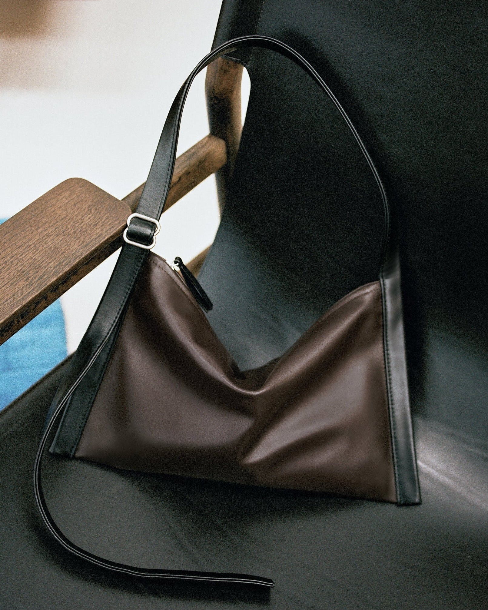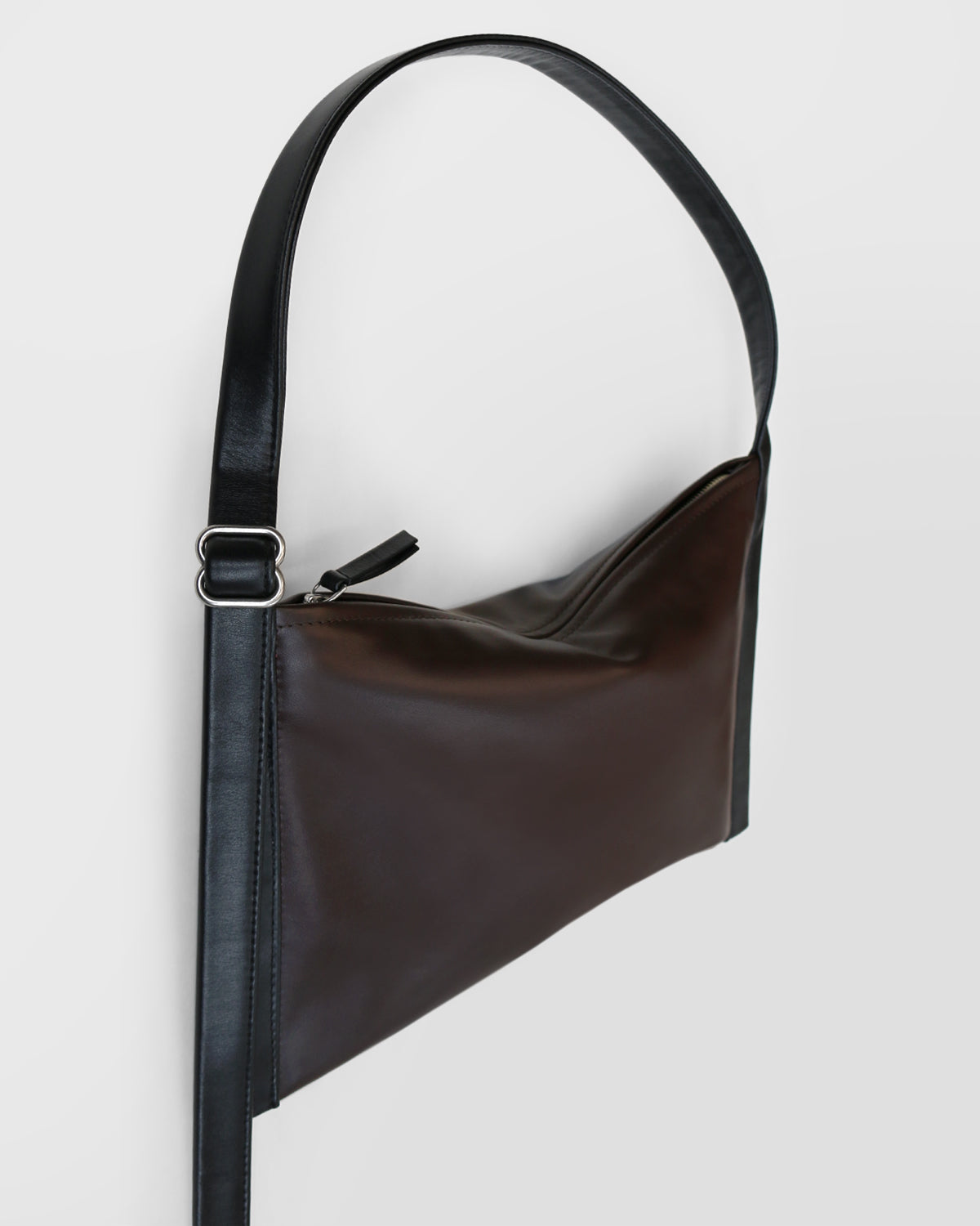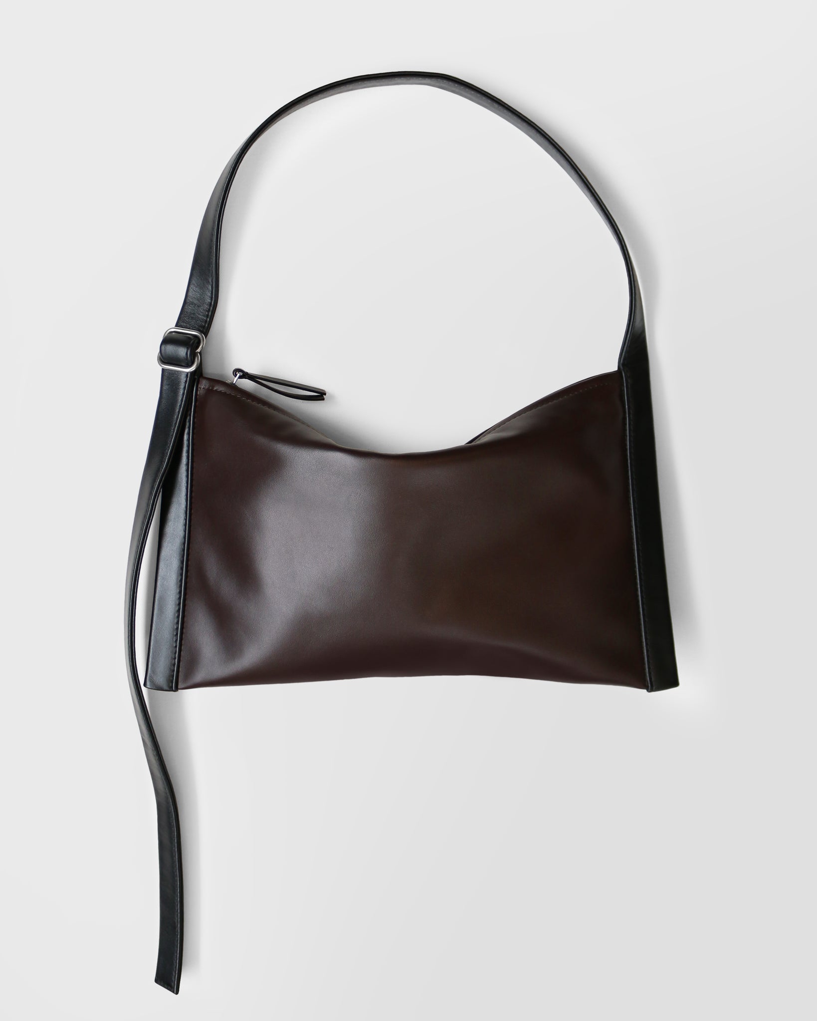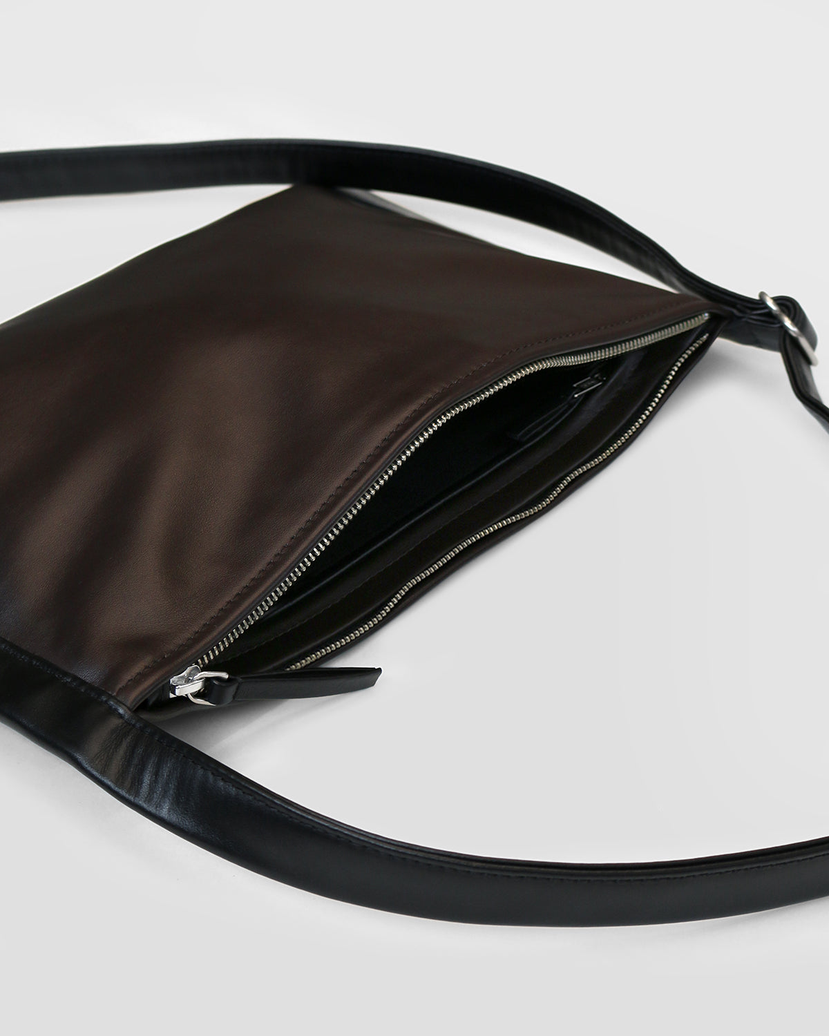Finely honed in its simplicity and detail, this essential bag is made for every occasion. The Coffee and Black hues create a deep, sophisticated two-tone effect with a supple feel, smooth finish, and luminous touch. It sits flat yet shapes naturally around what it carries, making it the perfect travel companion. Its adjustable strap offers effortless versatility, carrying with ease from day to evening.
