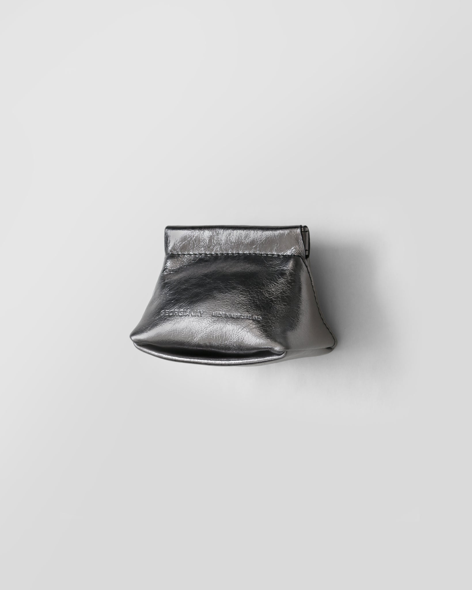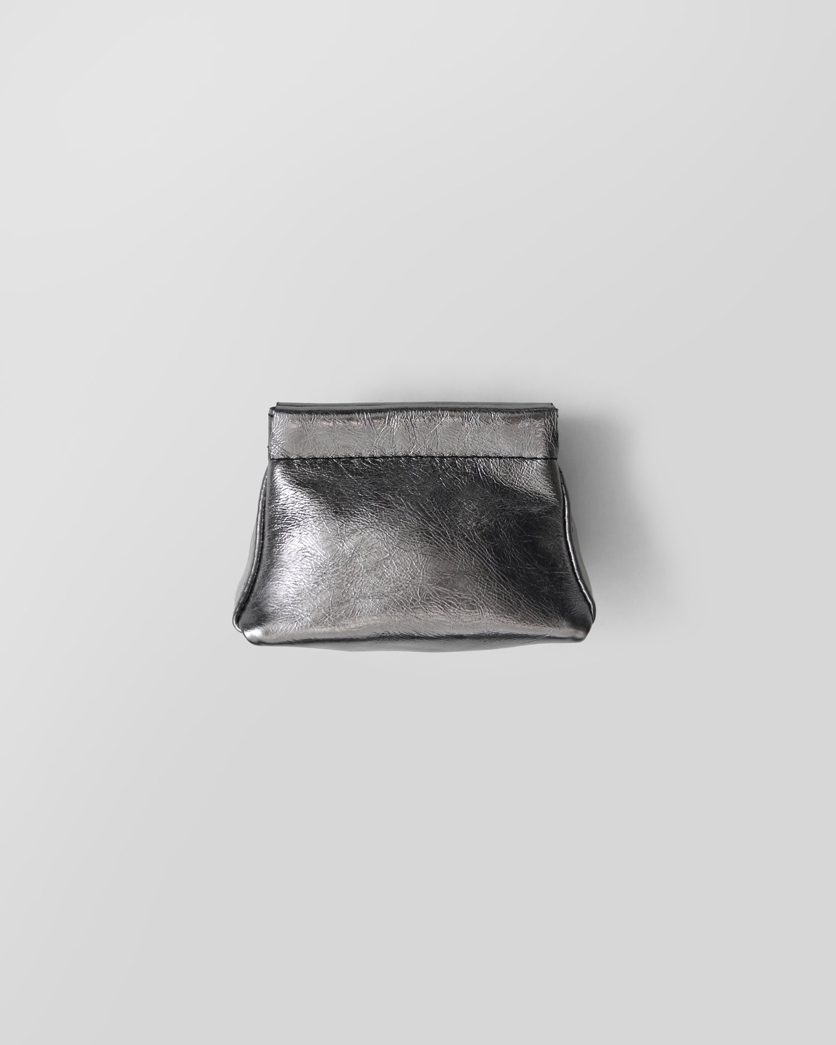 A softly sculpted pouch for everyday essentials. The Tinny metal carries a light, luminous sheen with a softly polished finish. Contrasted black stitching traces the form, adding refined definition with a contemporary edge. Asymmetric front darts frame a central compartment for coins and cash, while an external card sleeve allows cards to stack neatly.