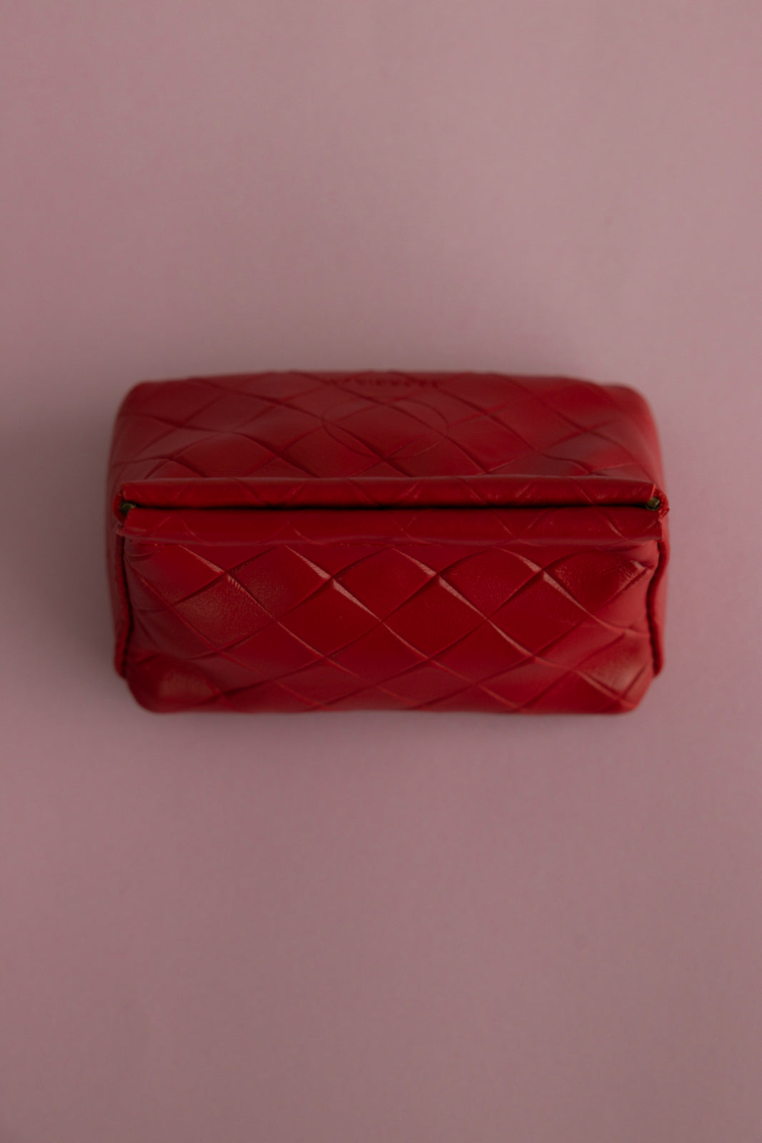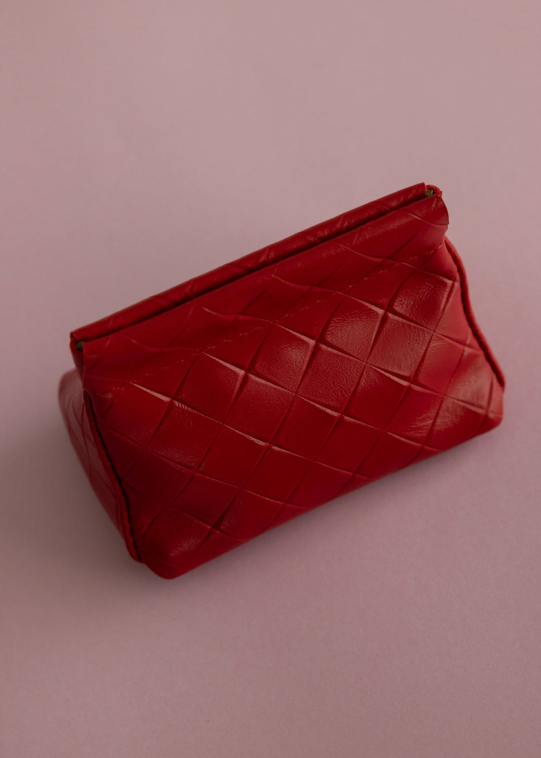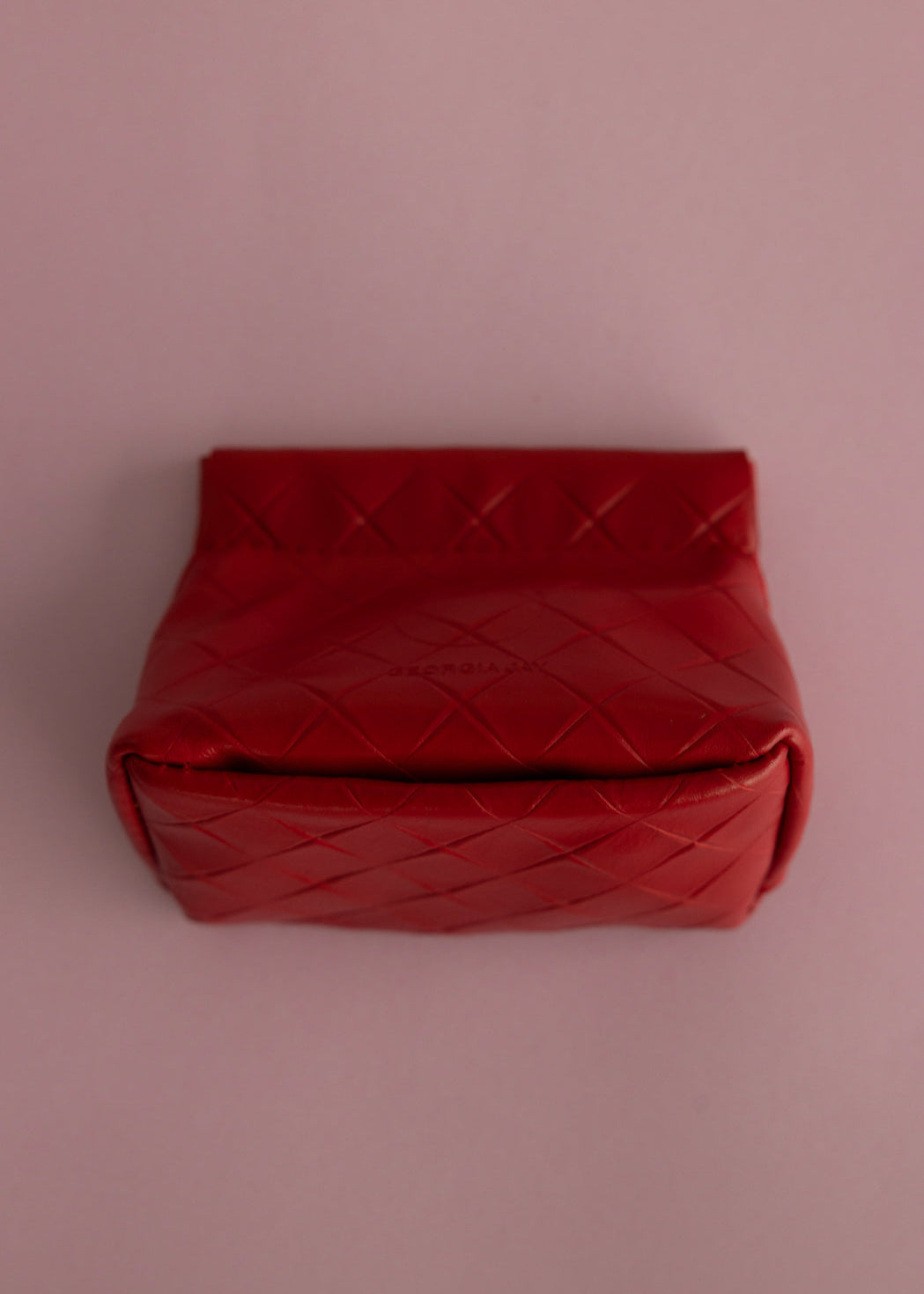 Designed with a playful spirit, this piece offers a sleek and secure home for your cards, coins, keys, and keepsakes. Featuring signature asymmetric front darts, an external card sleeve, and a flat-bottomed silhouette for structure.